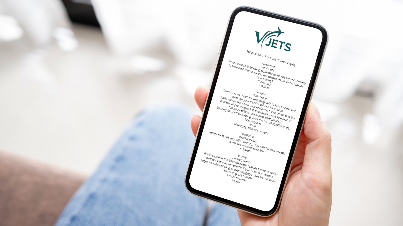 If you’re curious about how to book a private jet or just want to talk through your options, I’d love to help. Drop me a line at flights@vjets.com or call +44 131 210 0289 any time.